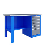 Однотумбовый. Допустимая нагрузка на столешницу 750 кг. Опорные элементы выполнены сварными из холоднокатаной стали. Верстак состоит из столешницы, опоры, тумбы P5 с четырьмя малыми и одним большим ящиком, полки-стенки и одинарного экрана с кронштейнами. Все металлические элементы покрыты полиэфирной порошковой краской. Столешница состоит из фанеры марки ФСФ толщиной 24 мм, которая покрыта лаком-антисептиком и листом оцинкованной холоднокатаной стали толщиной 1,2 мм. Размеры (ВхШхГ) 1470x1396x696 мм.