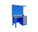 Однотумбовый. Допустимая нагрузка на столешницу 750 кг. Опорные элементы выполнены сварными из холоднокатаной стали. Верстак состоит из столешницы, опоры, тумбы P4 с двумя малыми и двумя большими ящиками, полки-стенки, двойного экрана с кронштейнами и комплекта освещения. Столешница состоит из фанеры марки ФСФ толщиной 24 мм, которая покрыта лаком-антисептиком и листом оцинкованной холоднокатаной стали толщиной 1,2 мм. Размеры (ВхШхГ) 1965x1396x696 мм.