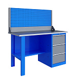 Однотумбовый. Допустимая нагрузка на столешницу 750 кг. Опорные элементы выполнены сварными из холоднокатаной стали. Верстак состоит из столешницы, опоры, тумбы P3 с тремя большими ящиками, полки-стенки и одинарного экрана с кронштейнами. Все металлические элементы покрыты полиэфирной порошковой краской. Столешница состоит из фанеры марки ФСФ толщиной 24 мм, которая покрыта лаком-антисептиком и листом оцинкованной холоднокатаной стали толщиной 1,2 мм. Размеры (ВхШхГ) 1470x1396x696 мм.