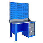 Однотумбовый. Допустимая нагрузка на столешницу 750 кг. Опорные элементы выполнены сварными из холоднокатаной стали. Верстак состоит из столешницы, опоры, тумбы P4 с двумя малыми и двумя большими ящиками и полки-стенки. Все металлические элементы покрыты полиэфирной порошковой краской. Столешница состоит из фанеры марки ФСФ толщиной 24 мм, которая покрыта лаком-антисептиком и листом оцинкованной холоднокатаной стали толщиной 1,2 мм. Размеры (ВхШхГ) 855x1396x696 мм.
