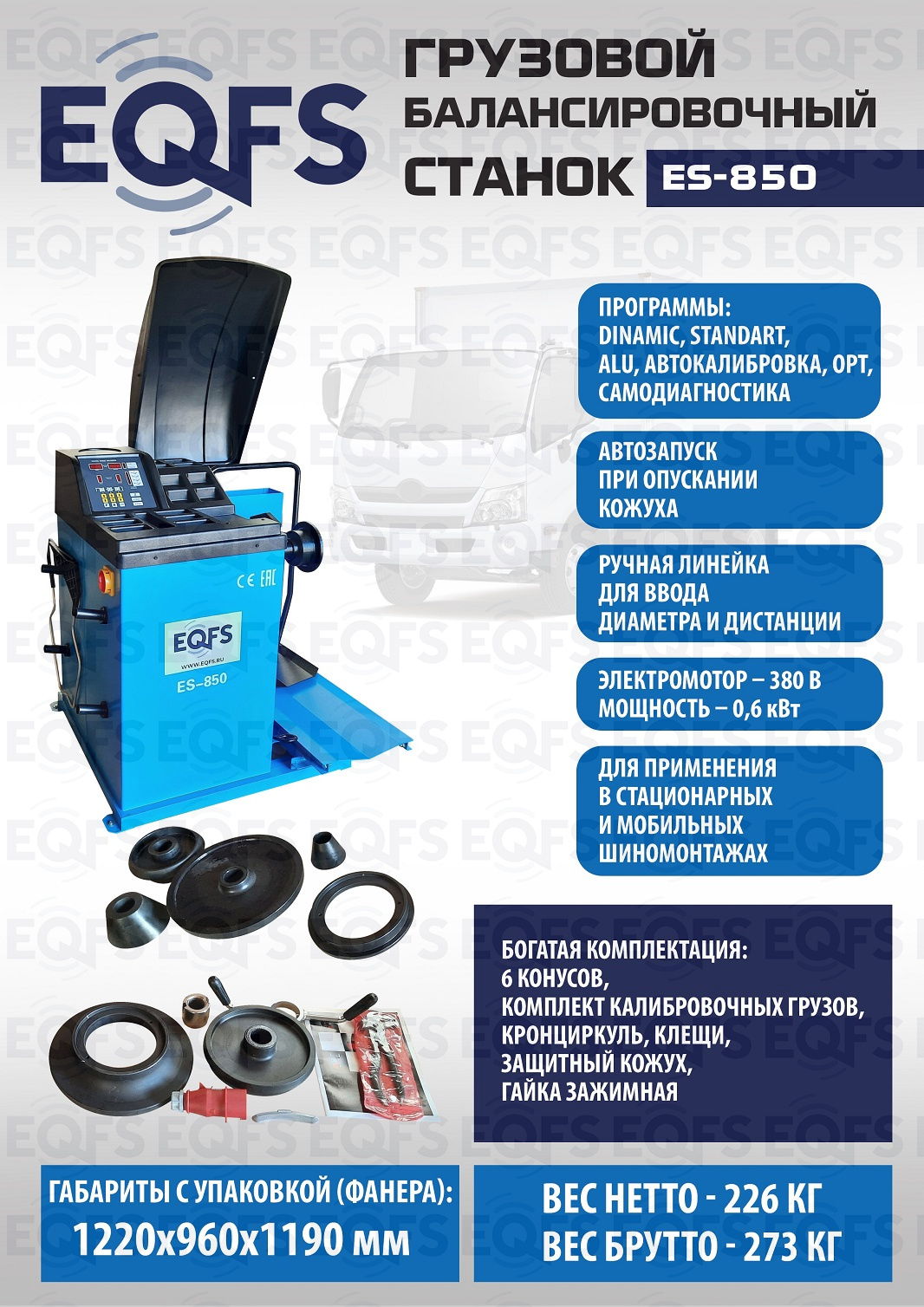 + ES-850 Балансировочный станок 380V. Балансирует грузовые и легковые диски - 13-24” ширина 1,5-20”, Колесо «в сборе» - до 1200 мм, вес до 150кг. Напряжение 380В. Встроенный пневмоподъемник. Балансировочный станок для шин легковых, грузовых автомобилей, автобусов, микроавтобусов и т.п.