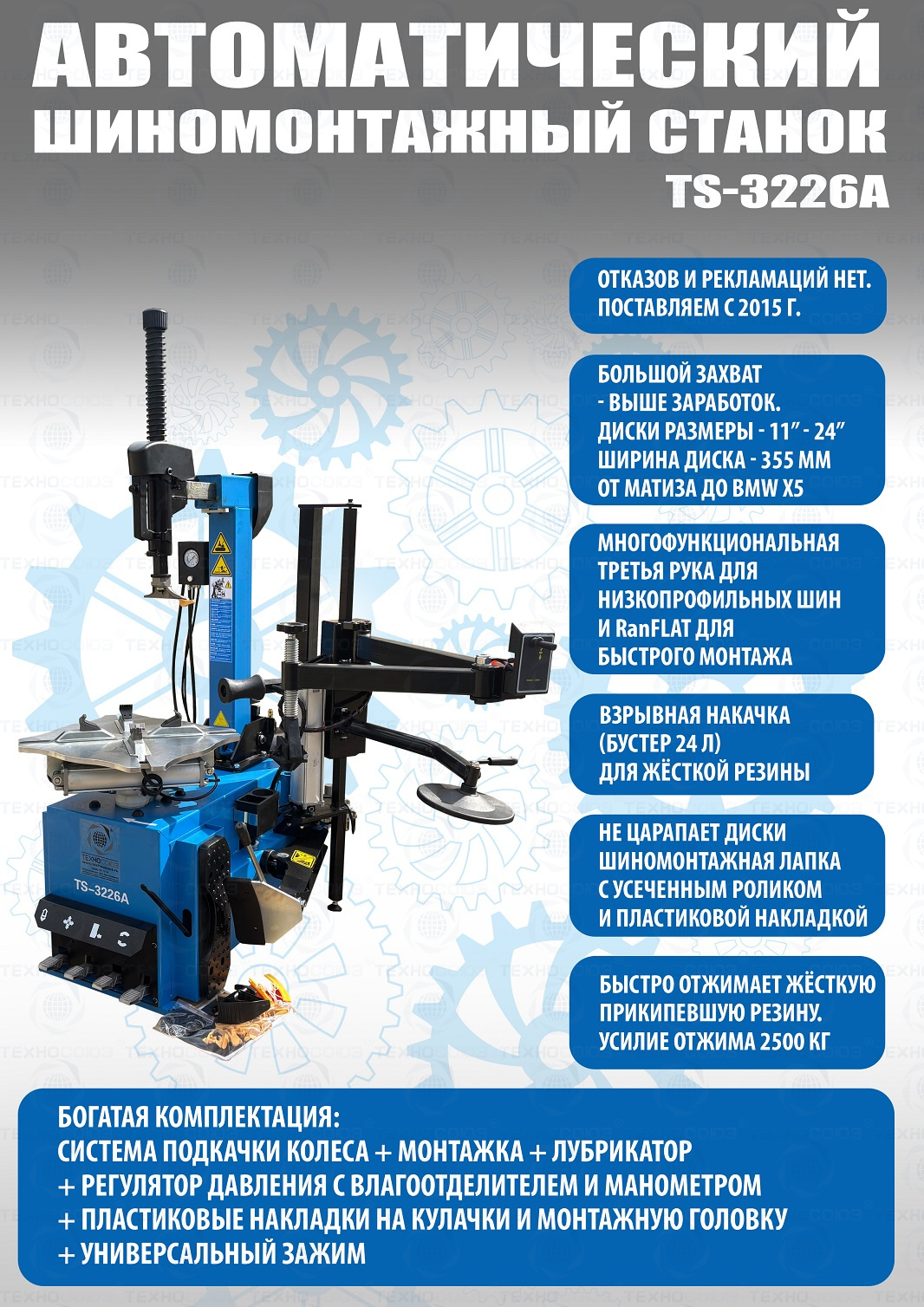 автоматического шиномонтажного станка TS-3226А предназначен для монтажа и демонтажа колес легковых автомобилей, легких грузовиков, не больших автобусов и коммерческой техники. Для дисков: 11÷24”. В комплекте: полноценная 3-я рука для работы с жесткой и низкопрофильной резиной RUNFLAT. + встроенный бустер 24 литра (взрывная подкачка) + пистолет для подкачки шин + монтажка + регулятор давления с влагоотделителем и манометром.