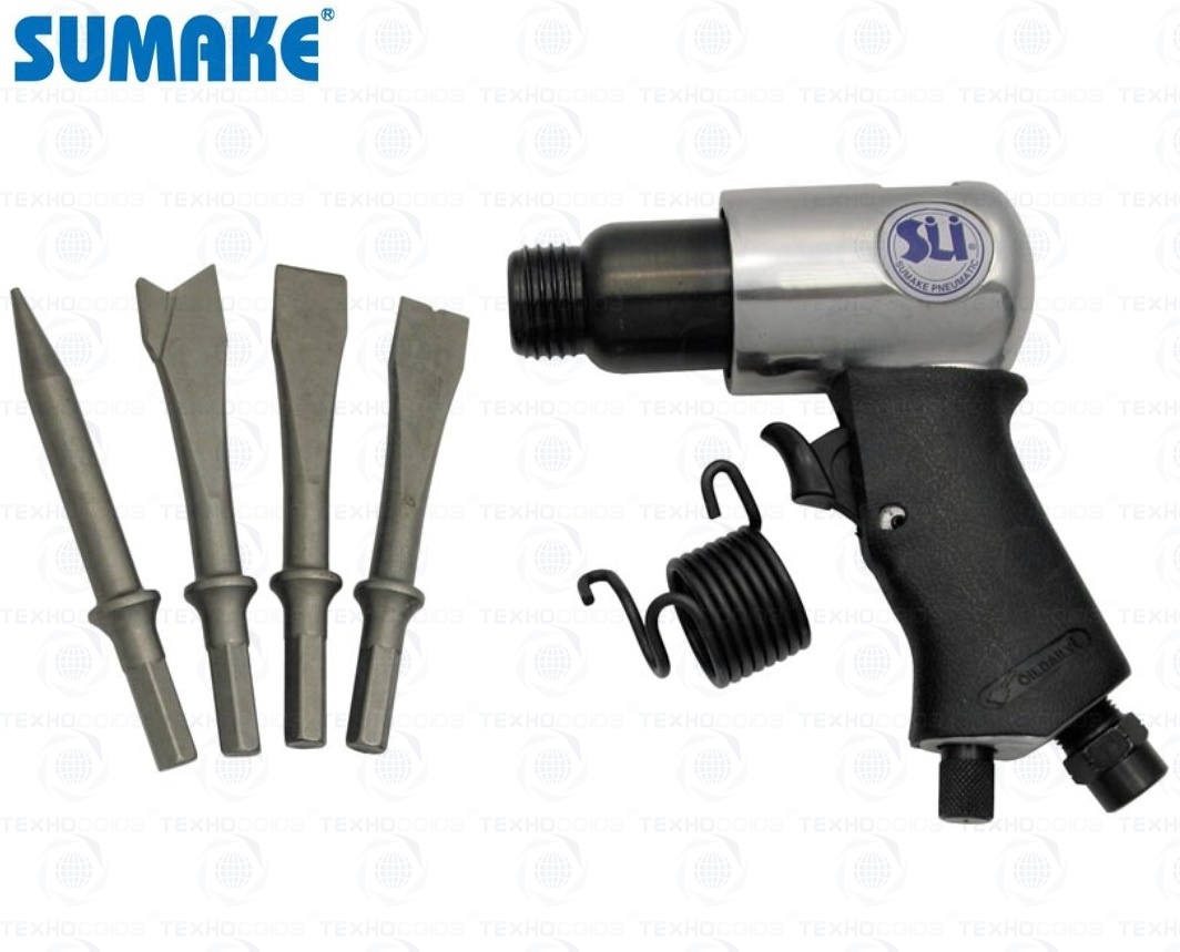 Пневмомолоток + 4 зубила предназначены для проведения как отбойных, так и зачистных работ. Частота ударов 4500/мин. Длина хода поршня 41 мм. Хвостовик зубила (шестигранник) 10,1 мм.