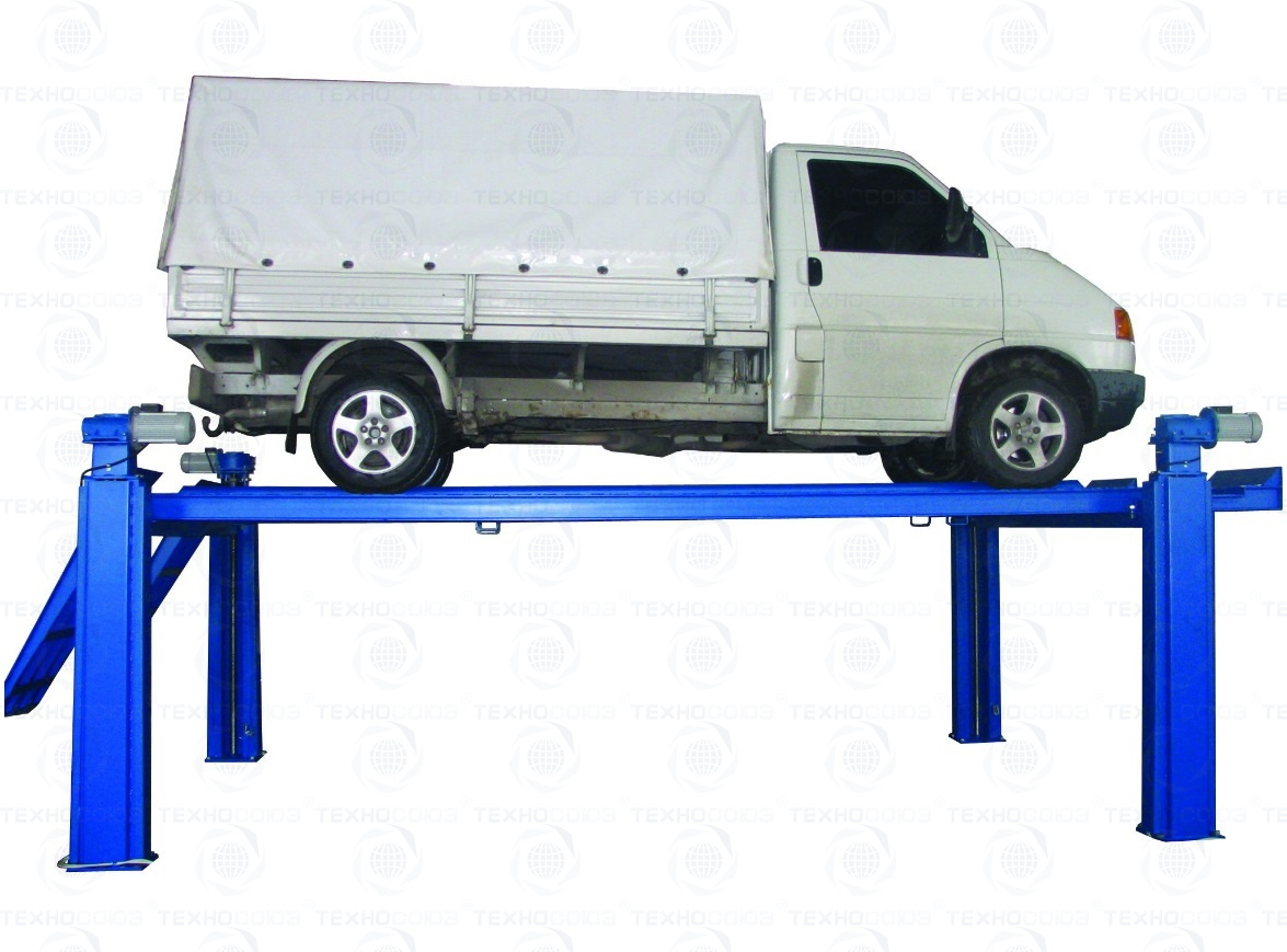 Электромеханический подъемник. Подъемник обеспечивает подъём любых автомобилей снаряженной массой до 5 тонн. Может устанавливаться на бетонируемые в пол рамы или на напольные рамы закрепляемые на полу анкерными болтами. Напольные рамы и анкерные болты поставляются вместе с подъемником по отдельному заказу. Рабочие гайки выполнены из полиамида повышенной прочности и износостойкости. Многоуровневая система безопасности. Привод ходового винта от червячного мотор-редуктора. По отдельному заказу подъёмники могут быть укомплектованы тележкой с домкратом для вывешивания передней или задней оси автомобиля. Подъемник комплектуется микропроцессорной системой синхронизации подъёма-опускания платформ. Подъемник специально разработан для установки стенда регулировки развала-схождения передних колес автомобилей.
