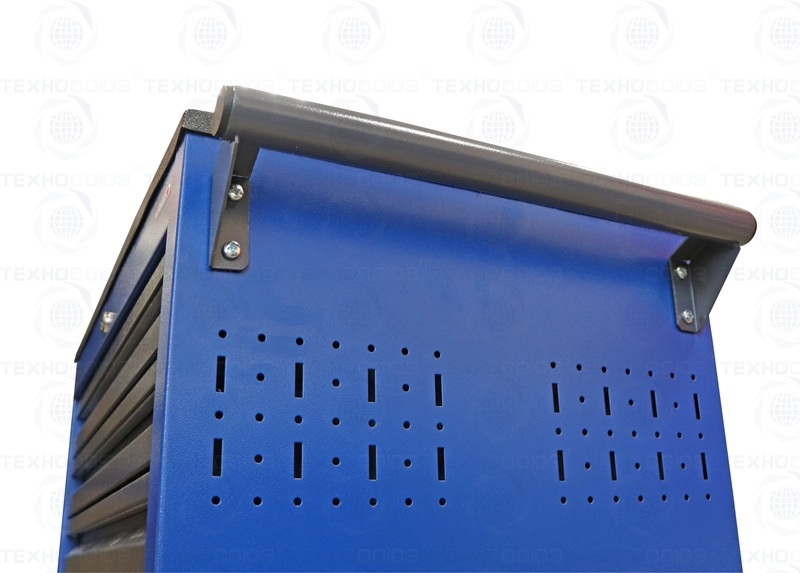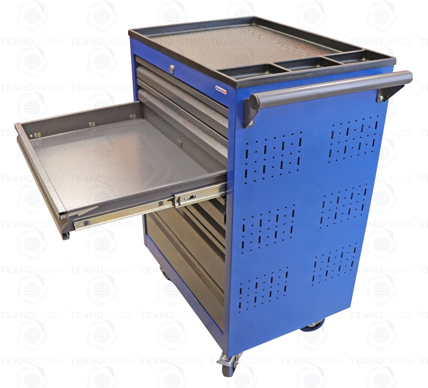 Тележки инструментальные серии PROFFI 950 предназначены для использования на предприятиях любого профиля занятых ремонтом и изготовлением различной продукции. На боковые стенки инструментальной тележки нанесена перфорация размером 25х25 мм и диаметром отверстия 8 мм, что позволяет устанавливать на них навесной инструмент или крючки. Наибольшей популярностью тележки инструментальные пользуются в сфере авторемонта и обслуживания автомобилей .Тележки имеют выдвижные ящики на шариковых телескопических направляющих полного выдвижения с фиксацией в закрытом положении, предотвращающее открывание при передвижении тележки. Ящики имеют центральный замок, который позволяет ограничить доступ посторонних лиц к содержимому ящиков. Тележка инструментальная изготовлена из высококачественного металла ведущих Российских производителей, покрашена порошковой краской производства Германии, имеет итальянскую и турецкую фурнитуру. Тележки для инструмента оснащены двумя не поворотными колесами диаметром 100 мм, одним поворотным и одним поворотным со стопором, которое фиксирует тележку и предотвращает непроизвольное скатывание.