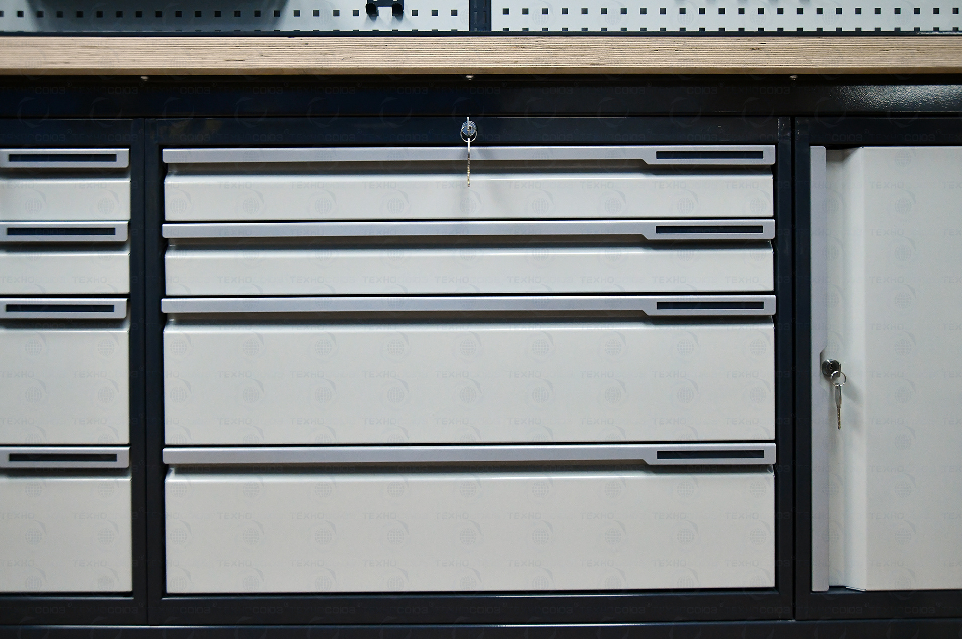 Модуль верстака выполнен сварными. Ящики в модулях устанавливаются на шариковых телескопических направляющих полного выдвижения.