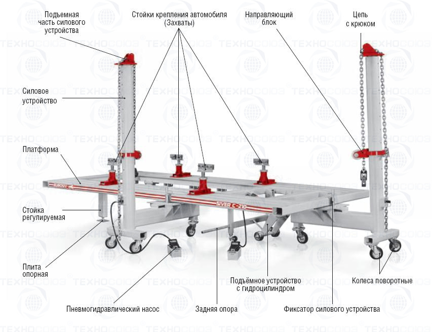 Стапель комплек-туется одним или несколькими силовыми устройствами с усилием растяжения 5 или 10 тонн.