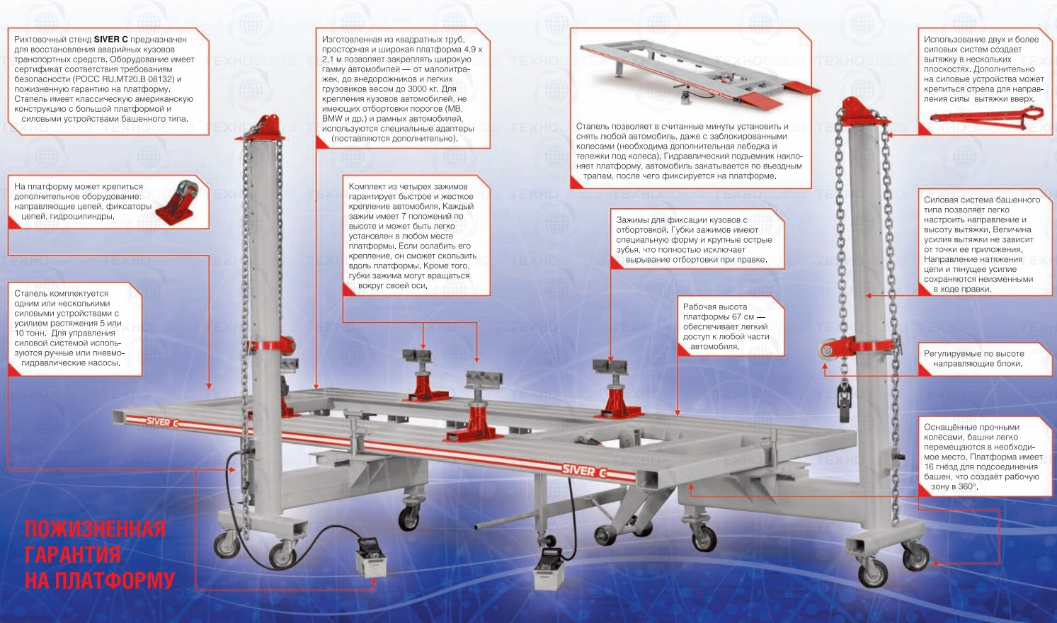 Силовые устройства оснащены прочными колесами и легко передвигаются вдоль периметра платформы, фиксируясь в любом из 16 гнезд, создавая рабочую зону в 3600.